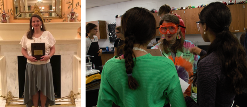Left: Welch with her award; Right: Welch and students making "chemistry come to life" in her classroom.