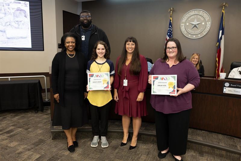 Humble ISD had two studentsβ art pieces selected for the 2023 Texas Youth Art Month Exhibit in Austin. They were honored at the March School Board Meeting. Photographed from left to right is Humble ISD Board of Trustees President Martina Lemond Dixon, Sconzo Early College High School Teacher Adrian Gibson, SECHS student Hailey Ansay, Humble ISD Superintendent Dr. Elizabeth Fagen and Kingwood Middle School Teacher Leslie Fernandez. Not pictured is KMS student Shelby Kite.