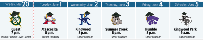 The Turner Stadium graduations were scheduled with the largest high school, Atascocita, going first, and the smallest high school, Kingwood Park, going last to maximize efficiency with set up and staging for ceremonies held over five consecutive days.
