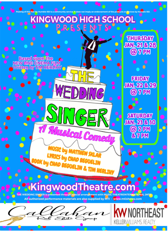 Kingwood High School Theatre presents The Wedding Singer at 7 p.m. January 21-23 and January 28-30, and 2 p.m. January 23 & 30. Tickets can be purchase at Kingwoodtheatre.com.