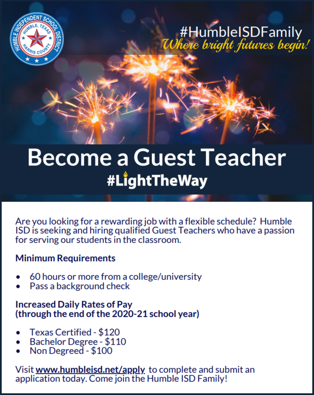 Are you looking for a rewarding job with a flexible schedule? Humble ISD is seeking and hiring qualified Guest Teachers who have a passiom for serving our students in the classroom.