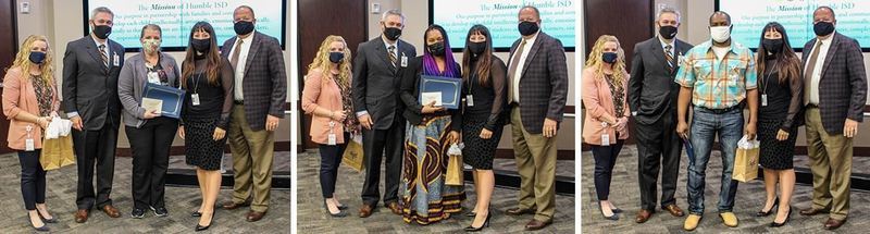 Humble ISDβs Super Staffers of the Month were recognized at the regularly scheduled Board Meeting on Feb. 23. This monthβs Super Staffer Awards is sponsored by Kingwood Emergency Hospital. Left Image: Kingwood Emergency Hospital Representative Claire King and CEO Jeremy Brynes, Elm Grove Elementary School Nurse Kerri Pennington, Superintendent Dr. Elizabeth Fagen, and Board President Robert Sitton. Center Image: Kingwood Emergency Hospital Representative Claire King and CEO Jeremy Brynes, Humble Middle School Algebra Teacher Shalonda Collins, Superintendent Dr. Elizabeth Fagen, and Board President Robert Sitton. Right Image: Kingwood Emergency Hospital Representative Claire King and CEO Jeremy Brynes, Warehouse Route Driver Marvin Thomas, Superintendent Dr. Elizabeth Fagen, and Board President Robert Sitton.