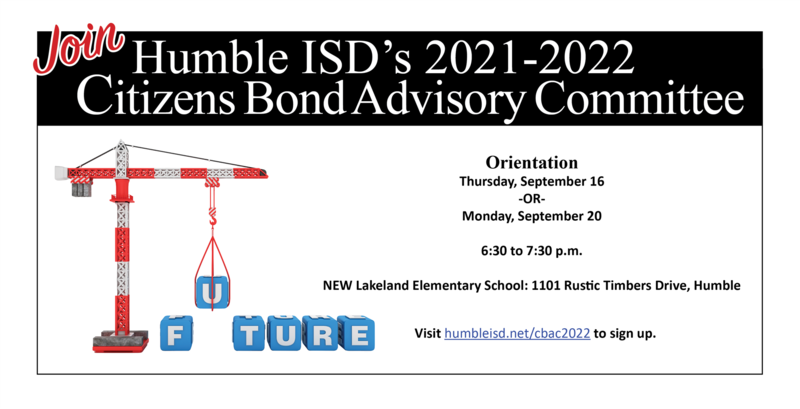 Humble ISD invites parents, staff members, students, residents, and district taxpayers to serve on the 2021-2022 Citizens Bond Advisory Committee (CBAC).