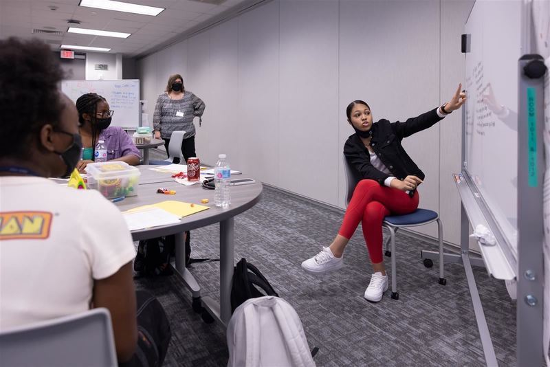 Atascocita High School student Mya Williams brainstorms ideas with fellow Student Voice Ambassadors to use in the design of sample assessments.