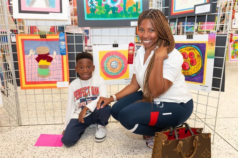 Centennial Elementary first grade student Nathaniel Drakes shows his artwork to his mother Margarita at the Humble ISD 2022 Fine Arts Festival.