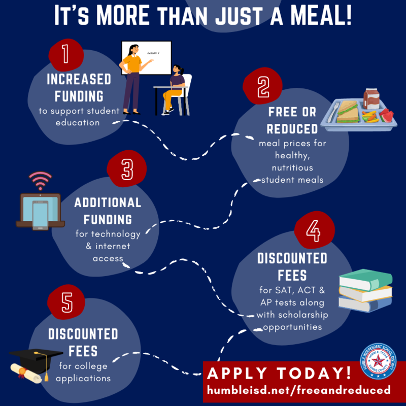 This important data also allows Humble ISD families to receive additional benefits such as discounted internet costs, reduced fees for SAT/ACT testing, help with college application fees, potential eligibility if P-EBT benefits are offered in the future, as well as maximizing important state and federal funding for individual schools. Applications are provided online at www.schoolcafe.com. Families will need to set up an account, then apply for free/reduced meals. Paper applications are available at the Child Nutrition Services Department located at 1705 Wilson Road, Building D.