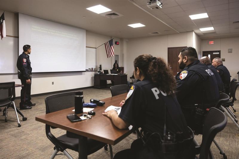 At right, Aldine ISD Police Officers and Humble ISD Police Officers receive training at an Humble ISD facility.