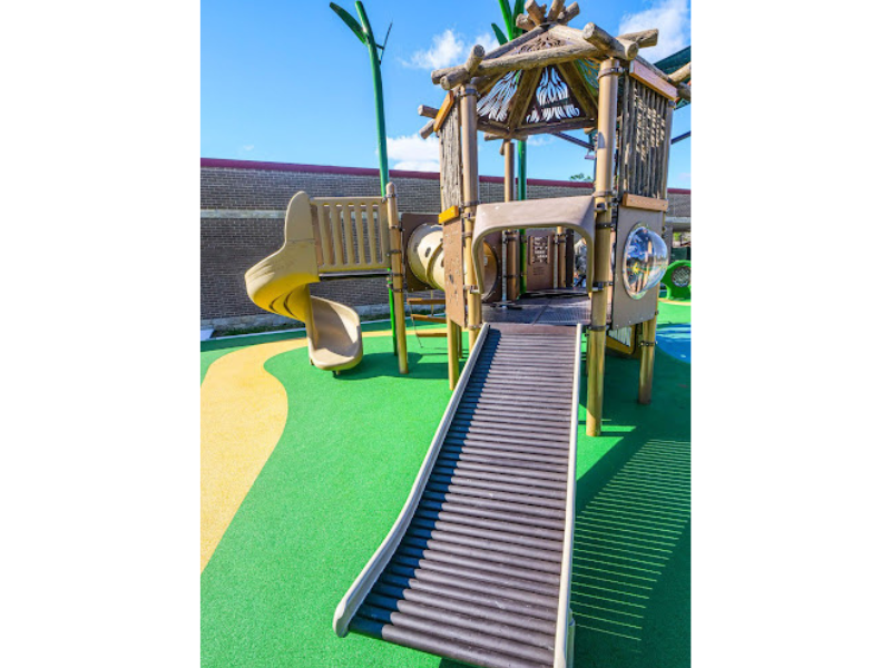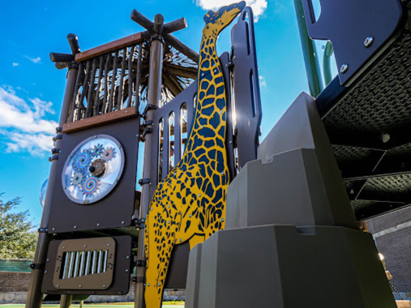 At Park Lakes Elementary School, for the younger students, the playground has a roller slide, a zebra bouncy rider, a spiral slide, a cozy dome, a giraffe cutout, and musical pieces to make sound.