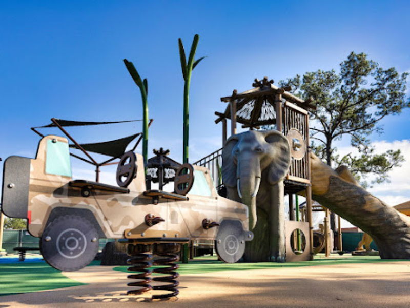 On the larger playground, equipment includes a lion, an outdoor classroom with log-shaped benches, a water buffalo, slides, climbers, spinners, swings, overhead climbers, a bouncy Jeep, spring pod steppers, global motion, sway fun and a sensory wall. The playground also includes a decorative elephant on the main tower, which includes a telescope to look out over the land, cut out photos of a cheetah and a rhinoceros, a standing giraffe and hippo and an alligator head to hop on over the image of a pond in the playground flooring. Also, there is a pretend Jeep with steering wheels. The handicap-accessible playground flooring features depictions of a trail surrounded by grass, a pond and a sunset on the Serengeti.
