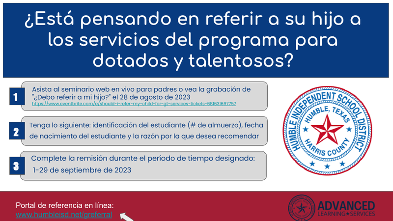 Find out more about Humble ISD's Gifted and Talented Program. Save the date August 28th for a live webinar. Check out the information on the flyer. Spanish Version see below.